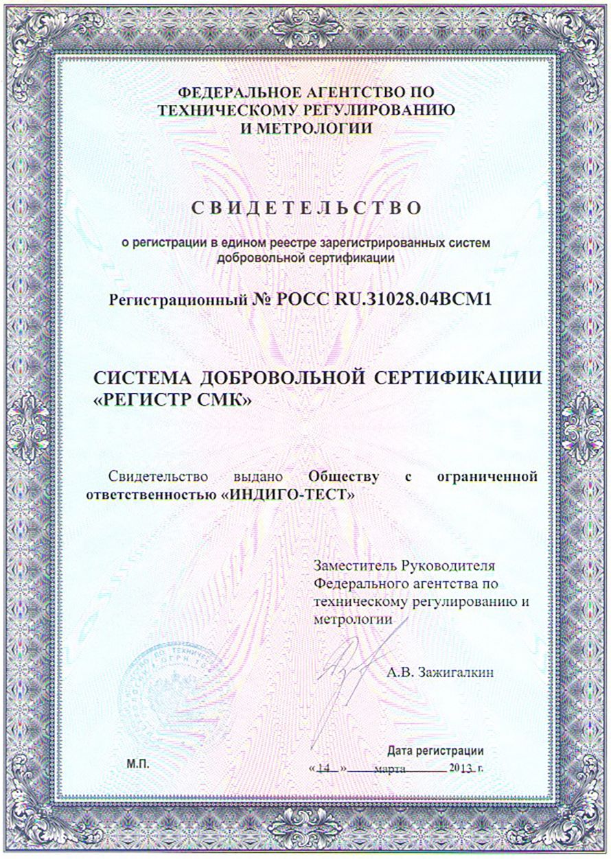 Свидетельство о регистрации в едином реестре зарегистрированных систем добровольной сертификации №РОСС RU.31028.04ВСМ1 от 12.04.2018 года
